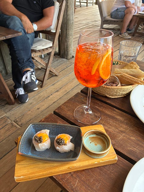 I was craving a long and late lunch as I mentioned earlier that I tend to crave on vacation, and this spot was highly rated on Beli and I wanted to perch near the beach with a spritz and grilled shellfish. I would absolutely come back here for the onion tart and the prawns. I wouldn’t order the octopus again, it was a bit chewy, but I think this is a good, casual neighborhood lunch spot for a solid afternoon cocktail that then fades into watching the sunset nearby on the Leblon end of the beach.