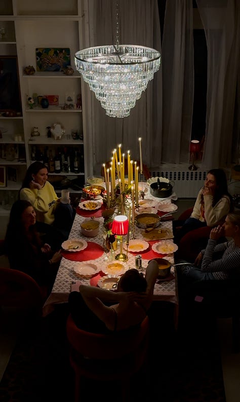 Let’s face it, [that type] of hosting is my preferred method of hosting, because I love food styling and tablescaping (I hate that this is now a verb), but I recently hosted a soup night with a few close friends where each friend brought a soup, which I realized was still a lot of work, but we ended up probably each spending less than $50 on our respective soups and had the best time passing around each one and trying everyones creation. This night reminded me of being a kid and going to a potluck after a sporting event where there were tables and tables of good food covering a landmass of foldable plastic from every parent in the community because everyone willingly just contributed ~one dish.